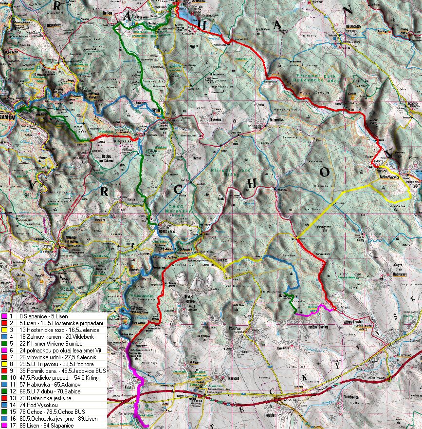 V Adamově nás potěšilo delší stoupání po schodech, celkem příjemná změna pohybu, zato stoupání na Alexandrovu rozhlednu, ač zpočátku celkem ušlo, bylo nakonec zbytečně dlouhé. Kousek před Babicema jsme dali krmící pauzu, psy odbyli hrstkou granulí, sebe nějakou (musli) tyčinkou a všechny malou porcí odpočinku. Během té nás předešel osamělý vlk ze slovenska Roman(?), což nás brzy zvedlo a vyrazili jsme s tím, že když si máknem, tak to snad ještě ujdem pod 24 hodin.