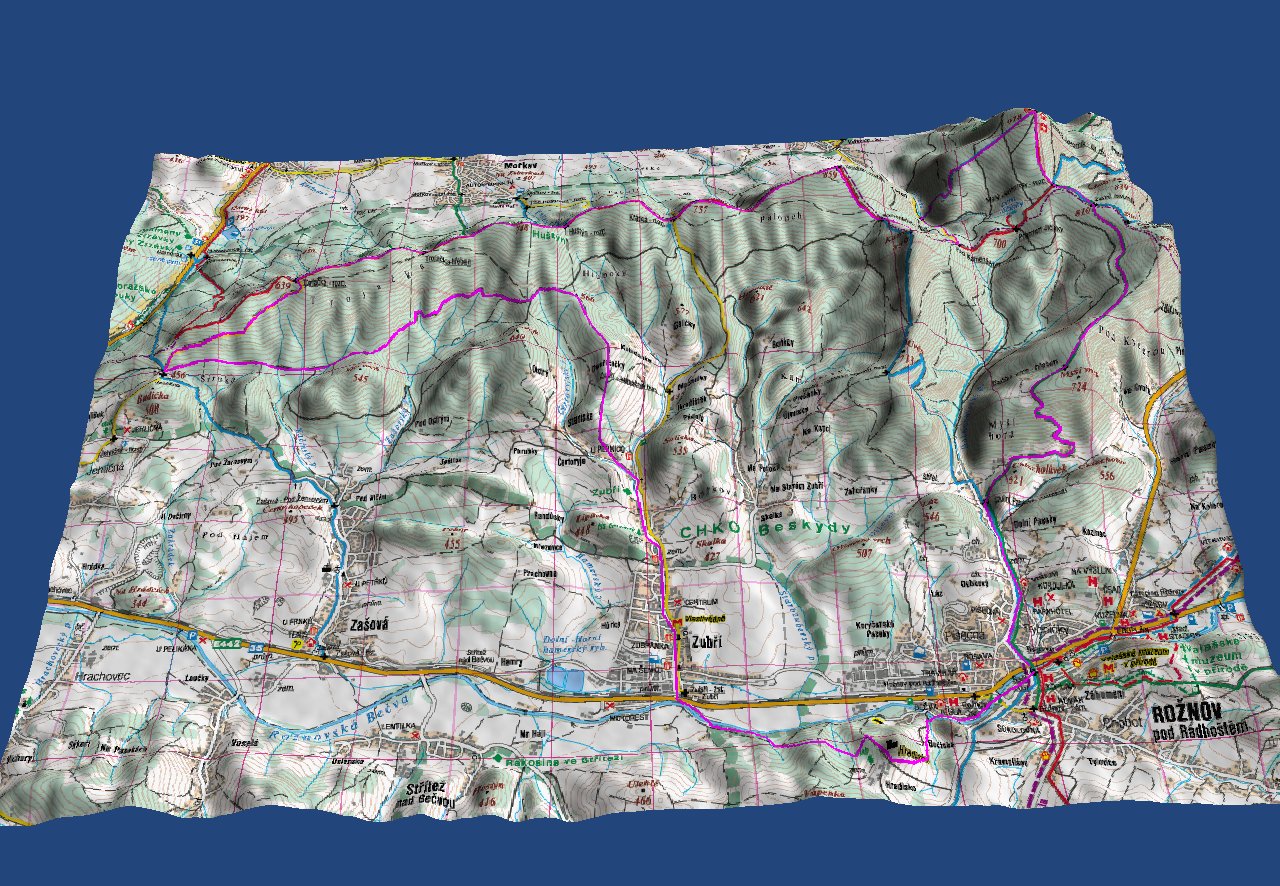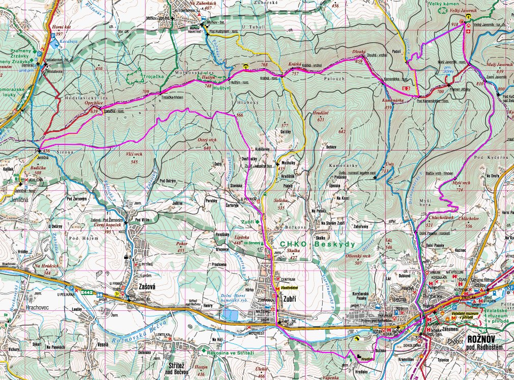 projdem Zubřím, přes cestu, přes most a napojíme se na Naučnou stezku Hradisko, kudy dojdem zpět do Rožnova